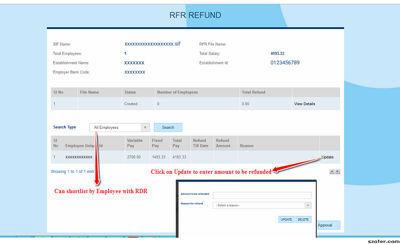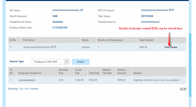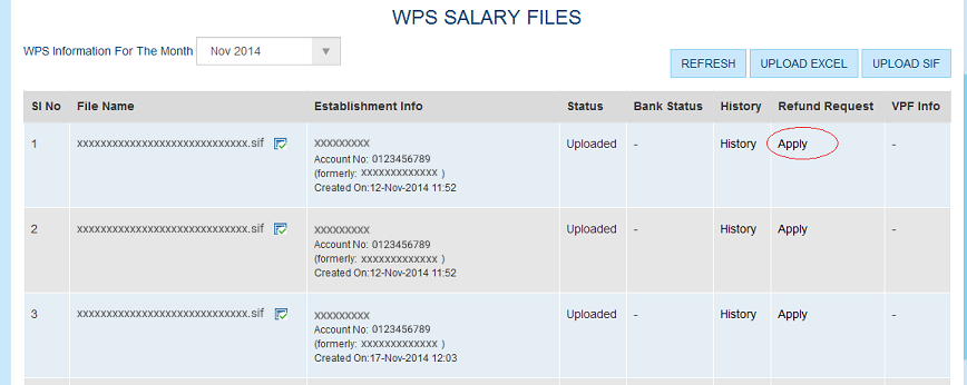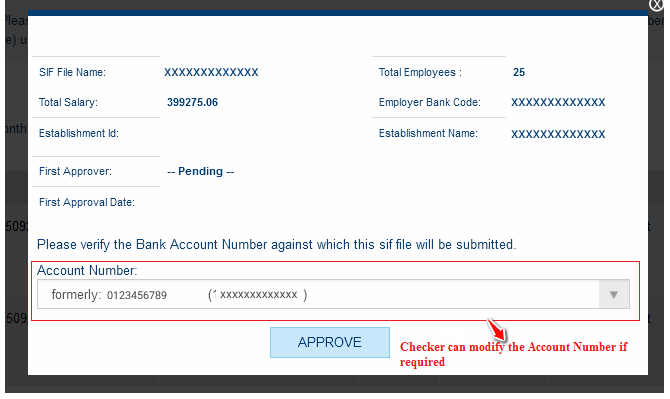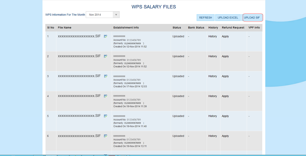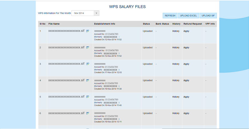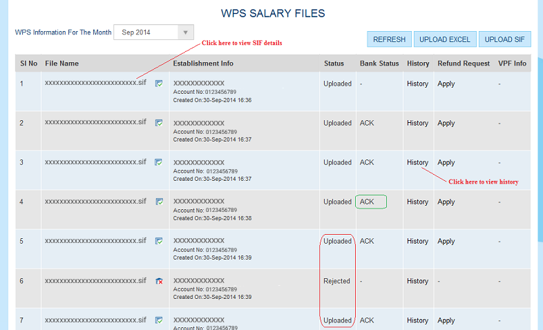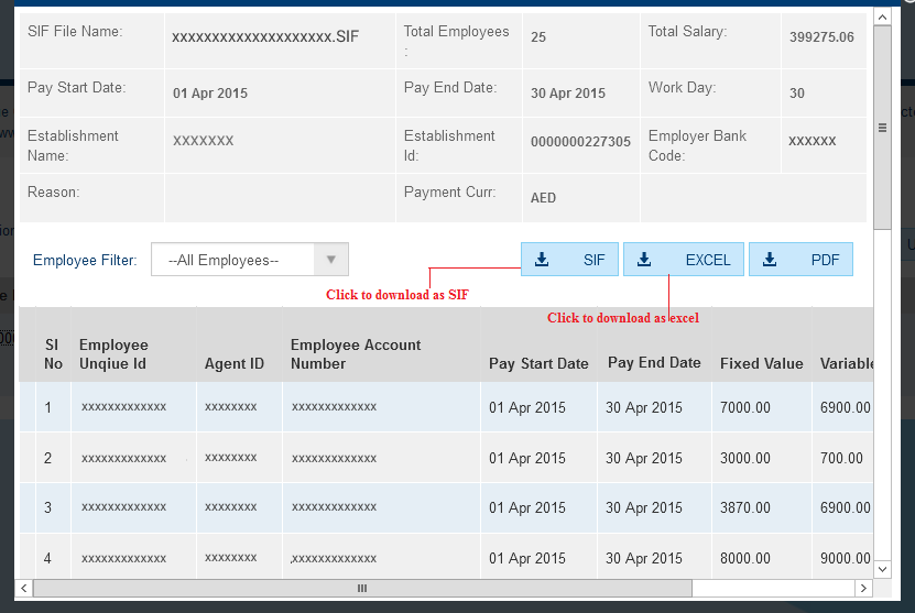 - SIF file Name, Establishment Info, Status, Bank Status,
